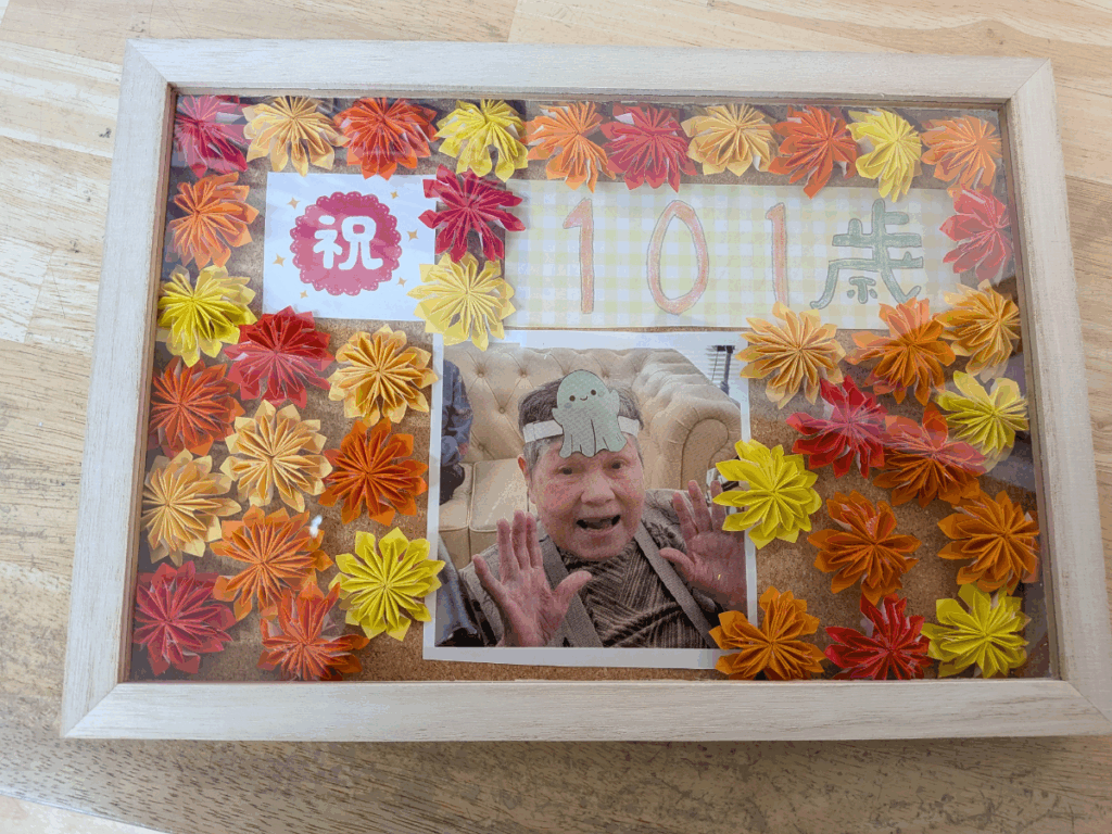 2025/11/19 なごみの家 🎂W様101歳バースデー🎂 今日はWさまの101歳のお誕生日でした。 午後から、お誕生会をして盛大にお祝いしました。 ご家族様も来られ、お花をプレゼント🎁してなごみの家からもプレゼント🎁 皆さんからは歌のプレゼント🎁でした。 くす玉も急遽用意したりとバタバタもしましたが、Wさんが終始笑顔で過ごしてくださって良かったです。 ←一覧へ戻る→