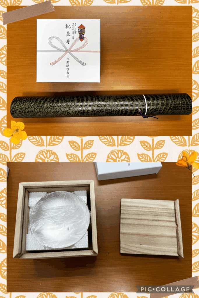 N様へ、国から100歳のお祝いとして石破元内閣総理大臣から表彰状と銀杯が贈られました😄