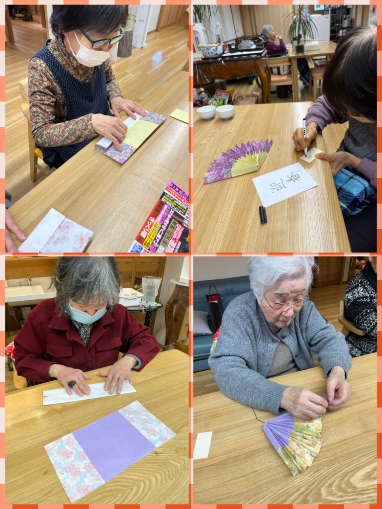 今日のレクでは、折り紙で簡単に作れる扇の吊るし飾り“作りに挑戦して頂きました。