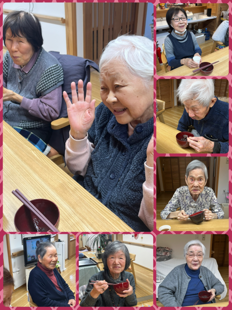 2026/01/12 四宮邸 大雅 おやつレク 今日のおやつレクでは、ぜんざいに入れる白玉だんごを利用者様に丸めていただきました。丸めた形や大きさを見て、『ちょっと大きい?』 と、それぞれ話し合い相談しながらだんごを作ってくれました。甘いものは皆さんお好きなようで、おかわりをされる利用者様が多数おられました♪自分が丸めた白玉が入っていないか探しながら、和気藹々とぜんざいを美味しそうに召し上がられていました☺️ ←一覧へ戻る→