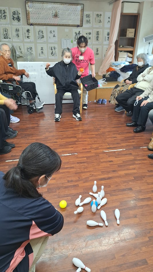 2026/01/16 デイサービス中徳島の家 ☆ミニボーリング大会☆ 本日のレクはミニボーリング大会!! カゴのボールを、2メートルほど先のピンめがけて転がします。 ピンが何本倒れたか、本数を個人で競いました。 あと一本!というところでは、 『おーーー!』 『あーーー!おしい!』 など、投げている方も見ている方も皆さん楽しんでおられました。 皆様ナイスコントロール!高得点続出でとても盛り上がりました。 ←一覧へ戻る→