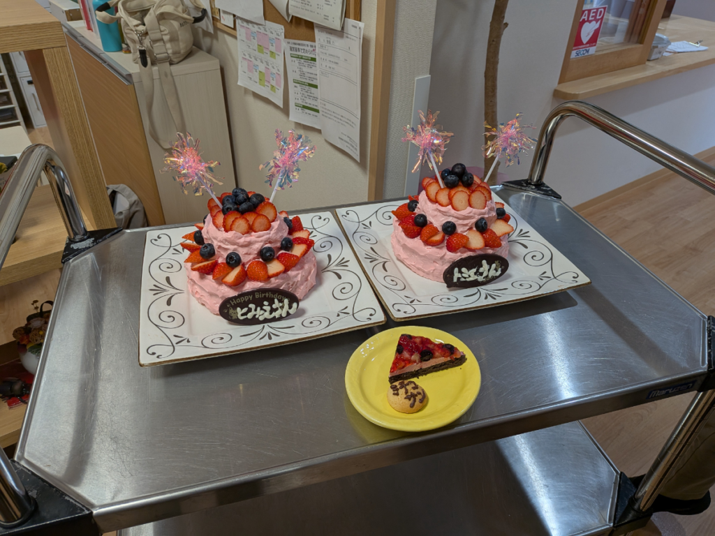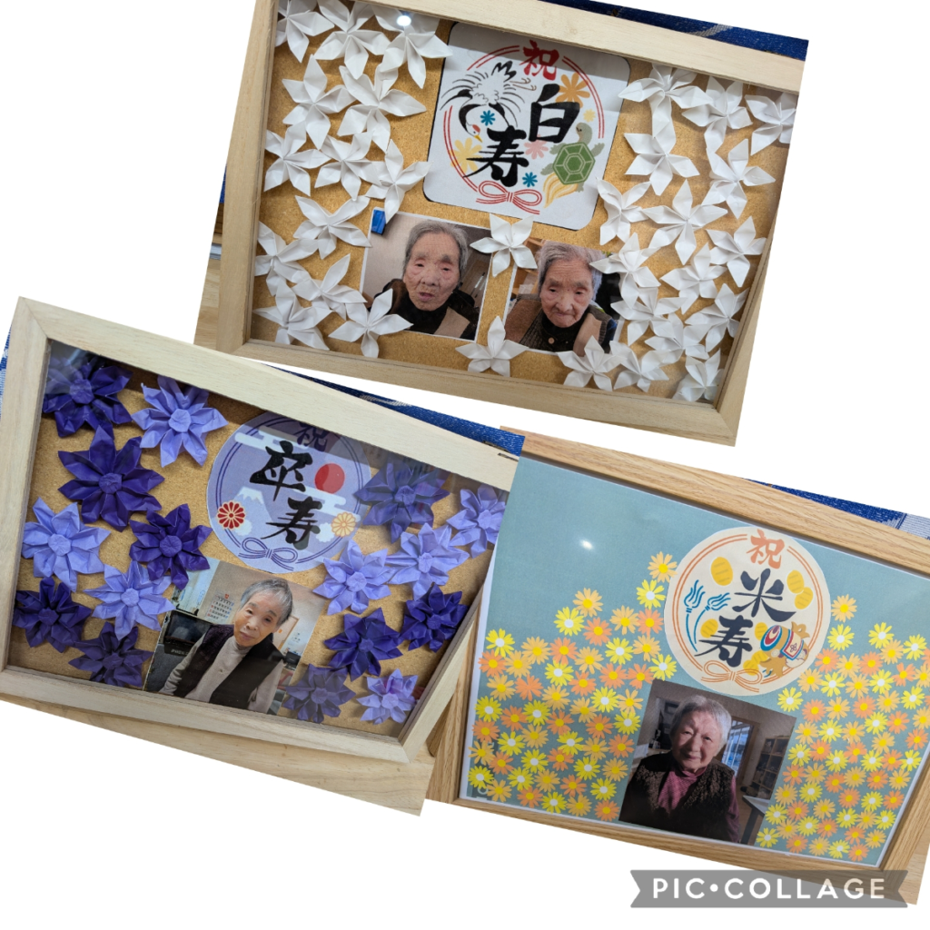 2026/01/23 なごみの家 🎂1月お誕生会🎂 今日は1月お誕生日を迎える方々のお誕生会を催しました。 S様は99歳で白寿、I様は90歳で卒寿、K様は88歳で米寿です。 皆さんに並んでいただき記念撮影をして、手作りプレゼントもお渡ししました。 白寿はもちろん白、卒寿は紫、米寿は黄色がいいとのことなので、それにちなんだお花で飾りを作りました。 皆さん喜んでくださり、代表してI様がお礼のあいさつをしてくださいました。 最後には厨房さん手作りのおいしそうなケーキが登場して、皆さん拍手をされ喜ばれていました。 皆さん元気で長生きしてくださいね。 ←一覧へ戻る→