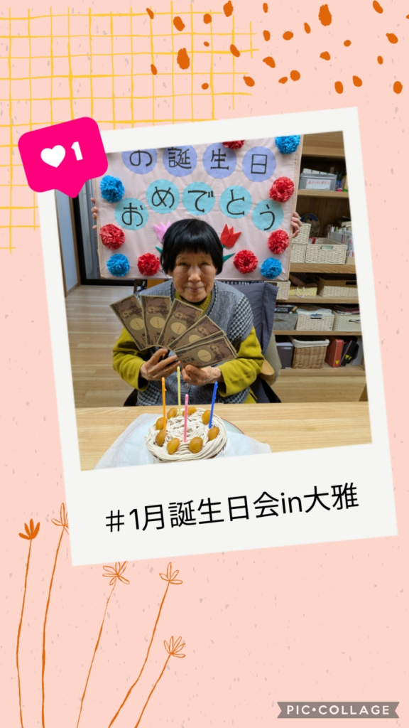 2026/01/23 四宮邸 大雅 1月誕生日会in大雅🎂 今日は誕生日会1月バージョンを開きました。 今回の主役はN様。 いつも笑顔で、自宅に送った際も 『気をつけて帰ってね』 と 、声をかけてくださる利用者様です。 誕生日ケーキのローソクも勢いよく消され、 他の利用者様にも「おめでとう」と祝福され、 照れつつもとても喜ばれてました。 今回のケーキは栗がのっており、食べやすくて 美味しいとの声が多くありました。 ←一覧へ戻る→