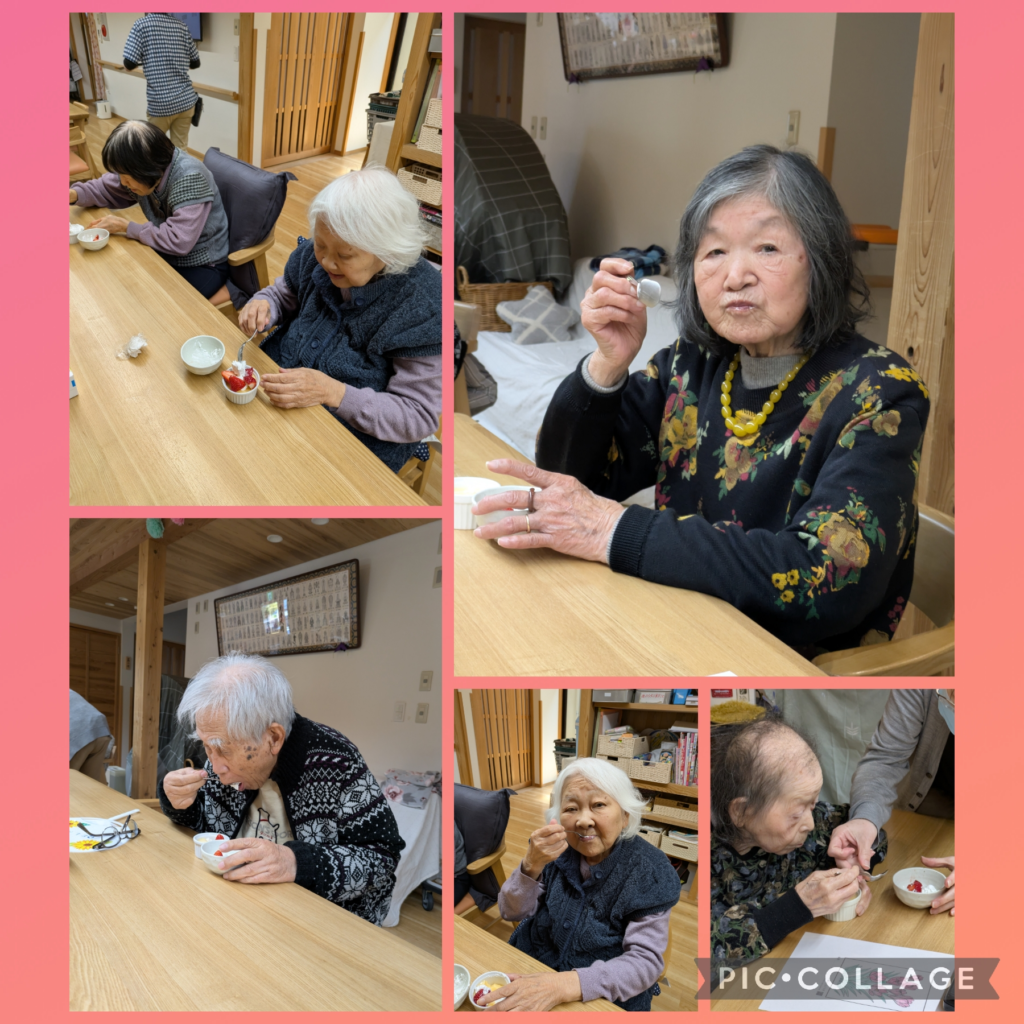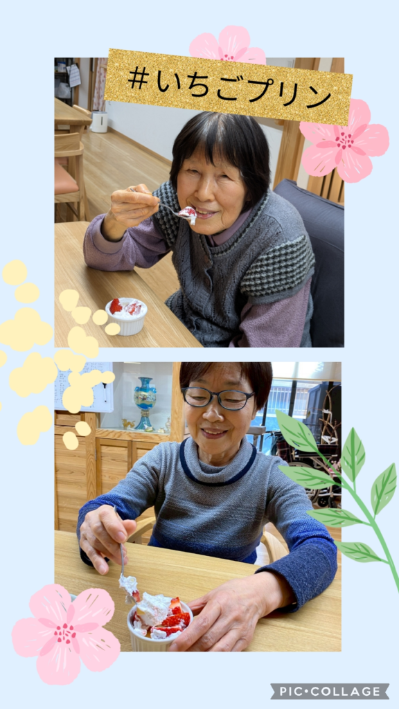 2026/04/09 四宮邸 大雅 おやつレク いちごプリン🍮 今月は、いちごプリンのおやつレクをしました。 この時期はいちごが旬になるので、いちごがあるだけで季節を感じました。 利用者様にいちごとホイップを のせてもらうような仕様で、 とてもきれいにプリンの上にいちごを のせられ楽しまれていました。 スプーンにホイップが引っ付き 少し苦戦することもありましたが、 同席の利用者様が手助けをするなど ほっこりしました。 「いちごも甘酸っぱくて美味しい」 と、大好評でした。 厨房スタッフさん、この日のためにプリンの用意 ありがとうございます🙇♀️ ←一覧へ戻る